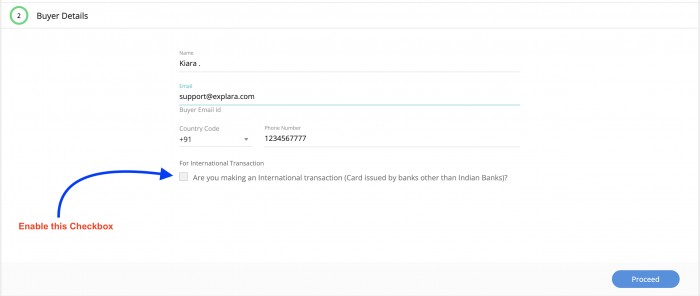 For International ticket buyers, first, select the ticket and then click on Proceed. Now, you will see a checkbox "Are you making an International transaction (Card issued by banks other than Indian Banks)?" in the Buyer Details Section. See the screenshot below: